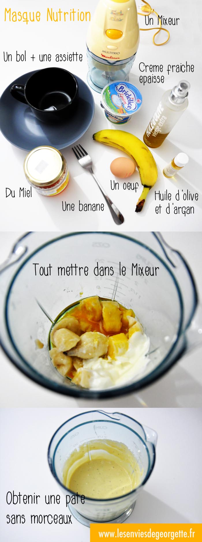 Couper des morceaux de banane dans le récipient du Mixeur, y ajouter un jaune d’oeuf, (réserver le blanc dans le bol pour un autre masque que je vous expliquerai plus tard, pas de gâchis !), y ajouter 2 à 3 bonnes cuillères de crème fraîche épaisse, 1 cuillère à café de miel , 5 bonnes cuillère à soupe d’huile d’olive, et 3 bonnes cuillères à soupe d’huile d’argan (en fait vous pouvez mettre que de l’huile d’olive ou d’argan si vous n’avez pas, moi l’huile d’argan me réussi plutôt pas mal, mais comme vous le voyez je n’en avais plus qu’un tout petit peu !! )