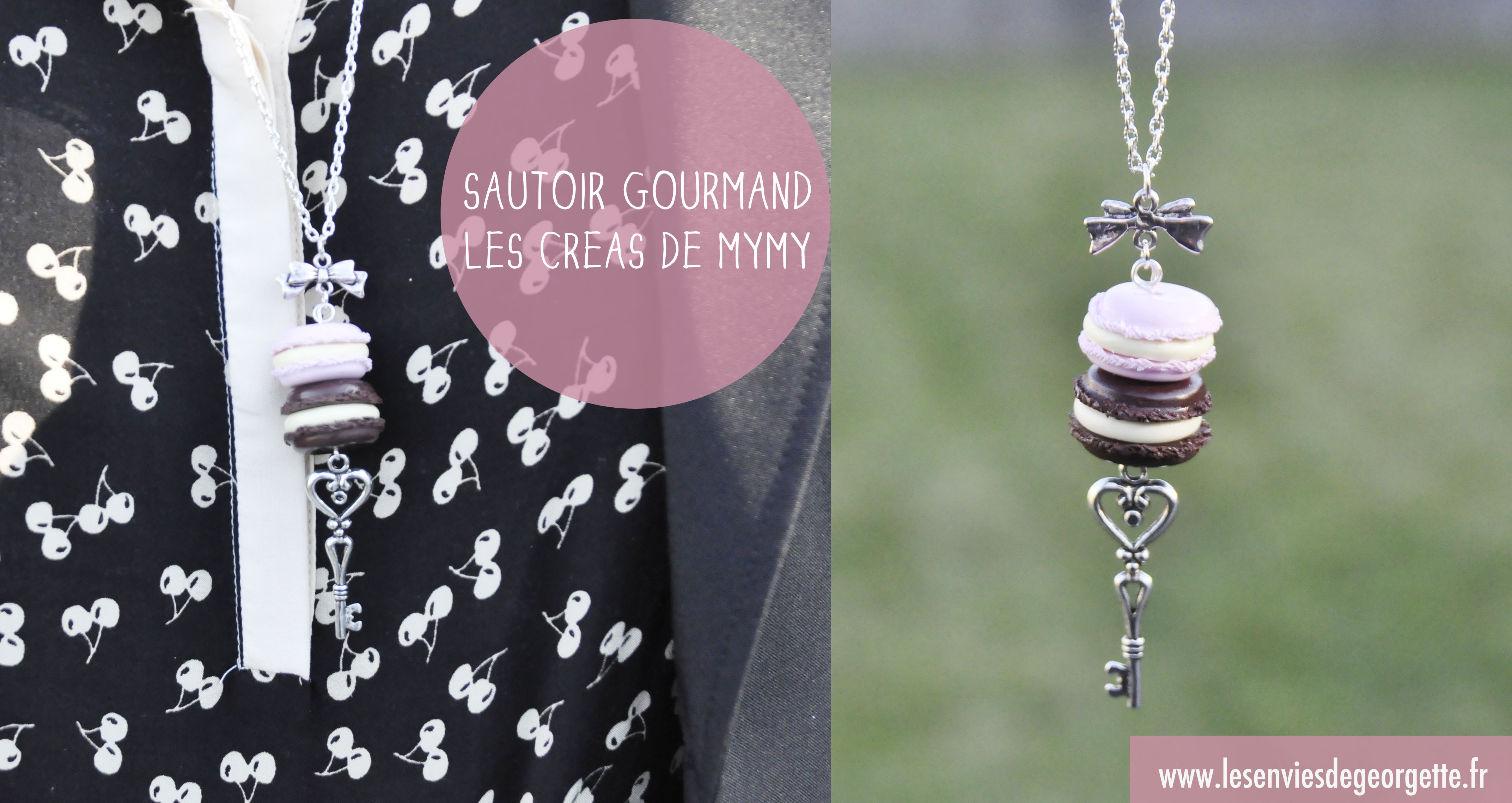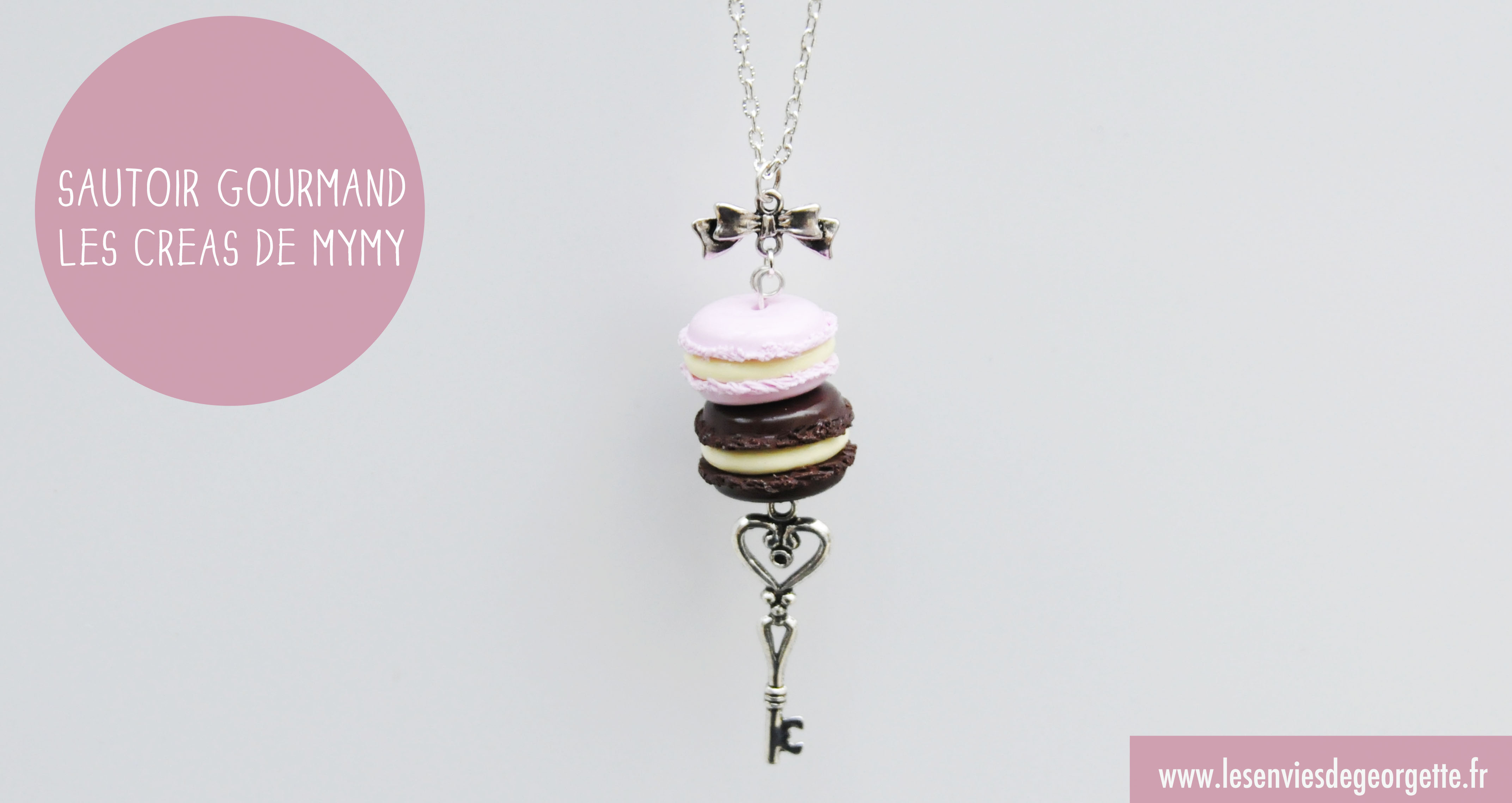 Elle m’a offert un superbe sautoir exactement comme j’aime, merci encore Mymy ! Donc 2 petits macarons à la fraise et au chocolat fourré vanille (non ça ne se mange pas !! ) avec un joli petit nœud et une jolie clé, c’est vraiment très sympa 🙂