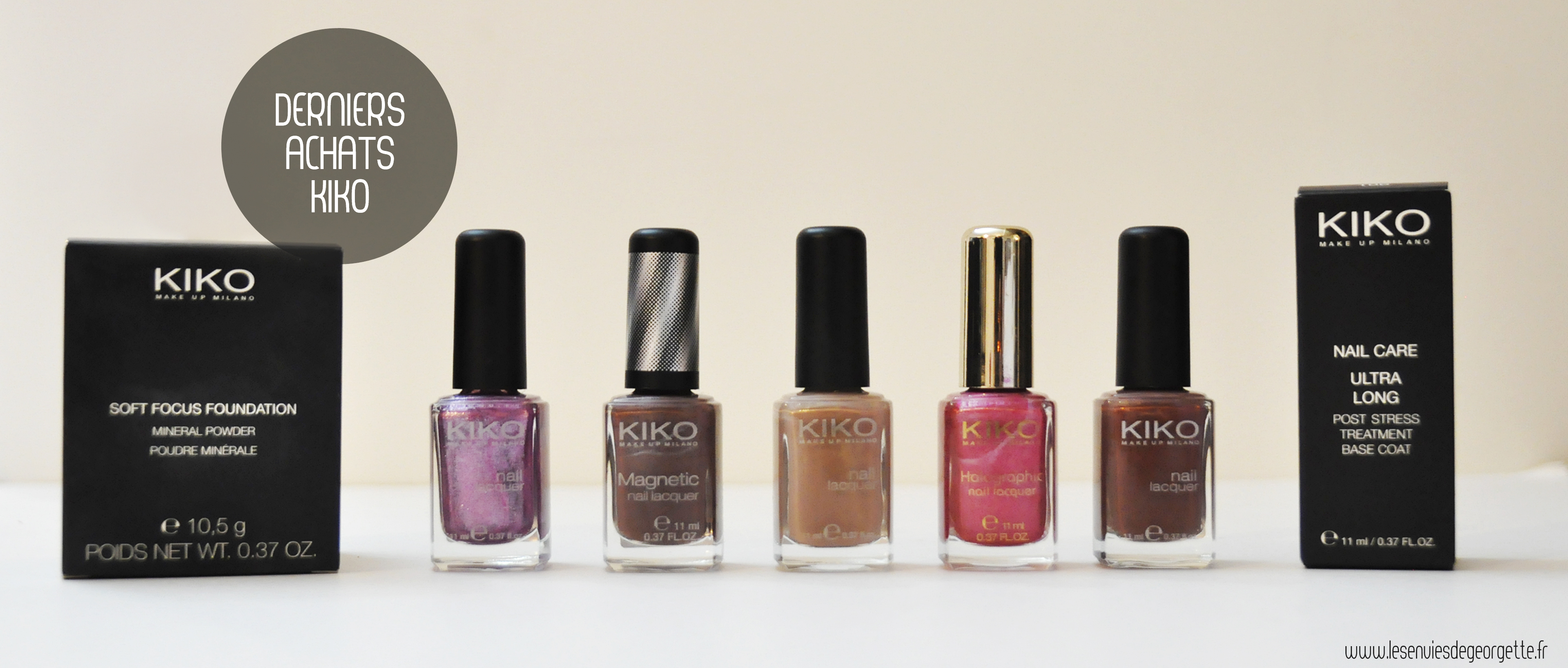 1. Coucou ma Georgette ! Même avec un mal de dent de dingue, j’ai quand même réussi à passer chez Kiko (bah à vrai dire, c’était sur le chemin du retour à la maison, donc…) et j’ai pris les 4 vernis Holo que je voulais de puis longtemps ainsi qu’un top coat mat. Les vernis holo sont top moumoutes, j’adore vraiment, y’a plus à tester le top coat mat. Bisoussssss miss et amuses-toi bien avec tes nouveaux joujoux !