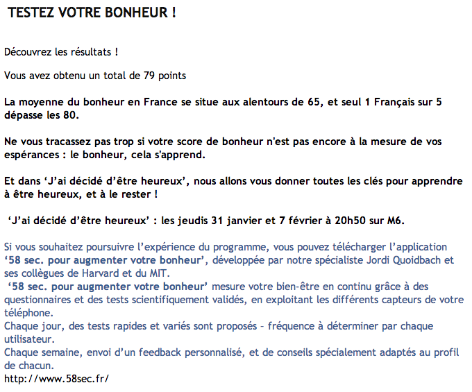 Après avoir rempli un questionnaire me demandant si oui ou non j’ai eu une semaine sympa, un total de point est cumulé. A savoir que pour être heureux il faut avoir 65, et seulement 1 français sur 5 atteint 80 qui est le chiffre du pure bonheur, je trouve ça un peu triste… Pour ma part, je suis à 79 ! Je pense que quand j’aurai Internet chez moi (ainsi que la cuisine et un frigo qui manque toujours à l’appel, n’est-ce pas Mister Good Deal ? ^^) je serai à 80 lol !
