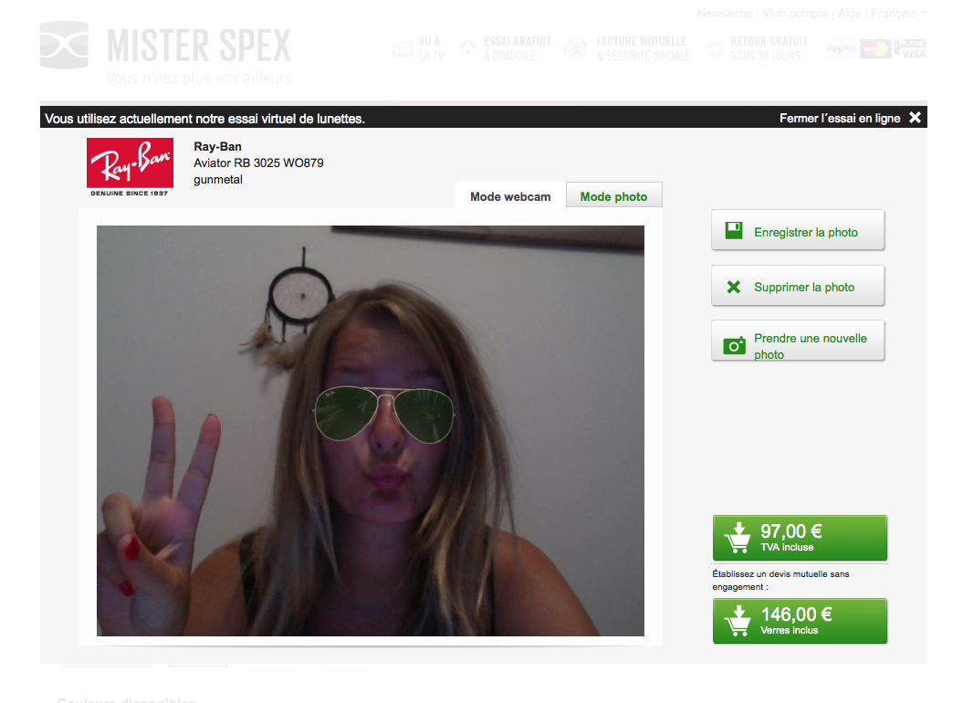Grâce à Mister Spex, j’ai eu la chance de recevoir cette paire sur laquelle je louchais depuis pas mal de temps ! Pour celles qui ne connaissent pas Mister Spex, il propose des lunettes de soleil, mais aussi de vue, et même des lentilles de contact. Ce qui est sympa, c’est qu’on peut les « essayer » en ligne, grâce à la webcam, voyez plutôt (on rigole pas de la photo, c’était le swaaar très tard 😀 ) :