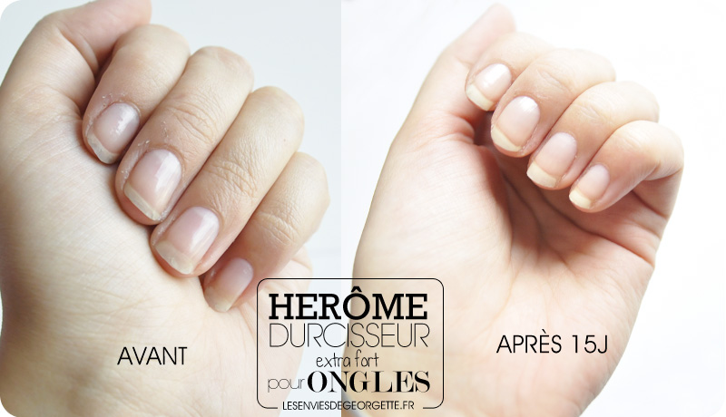 1 mois après la cure Hérome, à raison d’une application ou 2 par semaine du vernis + la prise des compléments alimentaires Forté Pharma, je suis contente du résultat.