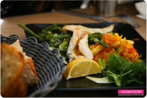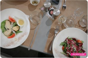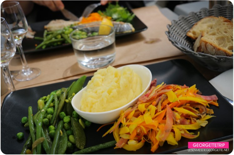 De notre côté, après un petit apéro de bienvenue, nous avons dégusté une salade césar (pour ma part sans viande), puis les filles ont eu un duo de dorade, avec un mélange de légumes verts (haricot, fèves, haricots plats, petits pois) et de carottes de plusieurs couleurs. Pour ma part, aucun soucis sur le fait que je sois végétarienne, ils m’ont remplacé le poisson par une purée absolument délicieuse.