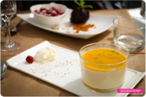 En dessert, panna cota caramel ou fruit de la passion (il fallait choisir), pour les intolérantes au lactose, c’était un sorbet de cassis avec des framboises.