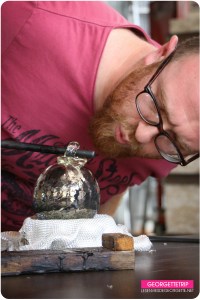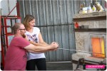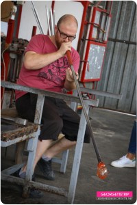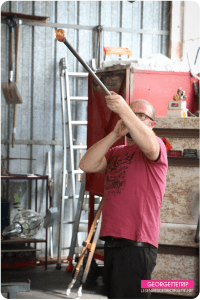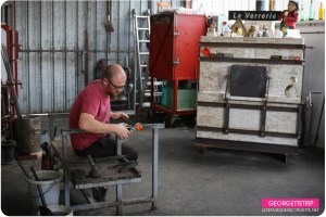 Si on m’avait dit un jour que j’allais souffler dans du verre  à 1120°, je ne l’aurai pas cru ! Mais lors de la première activité du Georgette Trip, Sylvain Nougaret, le souffleur de verre de Ruoms, nous a fait découvrir son monde et même mettre la main à la patte le temps de quelques minutes !