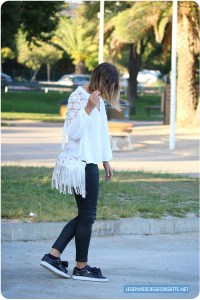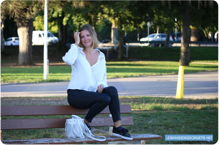 Même si les après-midi sont plutôt agréables, autour des 20 degrés, je dois bien reconnaitre que ces derniers jours un petit foulard était recommandé en plus de la veste. Dans tous les cas, moi je ressors mes tops manches longues et si j’ai acheté cette blouse cet été, je la mets ENFIN maintenant. Sur les photos, je ne mettais rien en dessous car il faisait vraiment beau ce weekend là, mais maintenant, j’ajouterai un petit débardeur… aussi parce qu’elle est un peu transparente et qu’en été, la transparence ça passe mais en automne, c’est chelou.