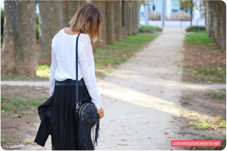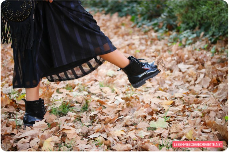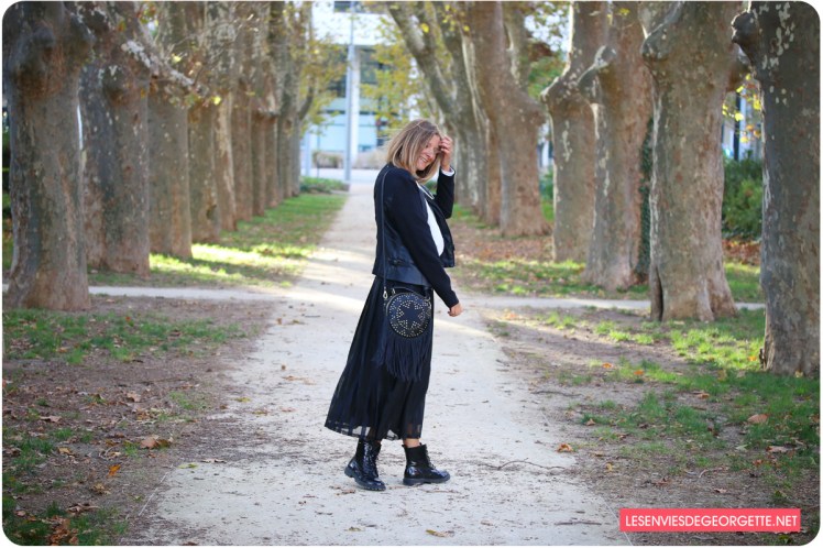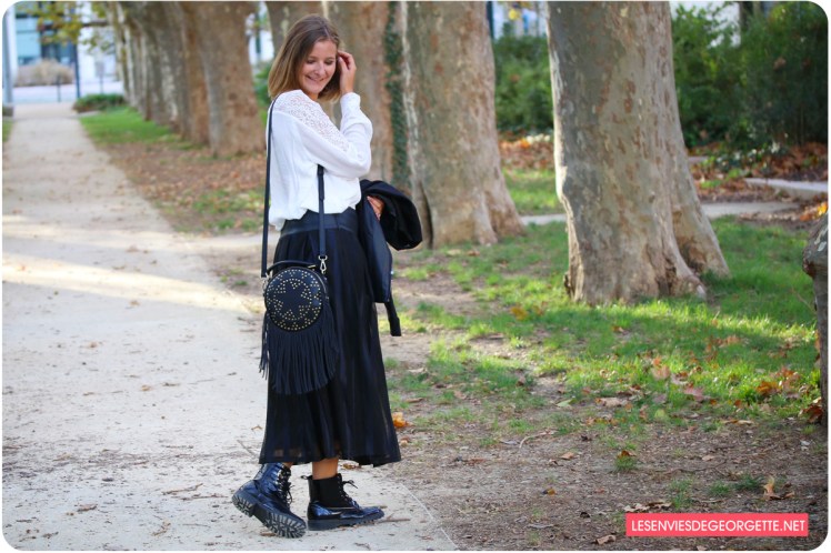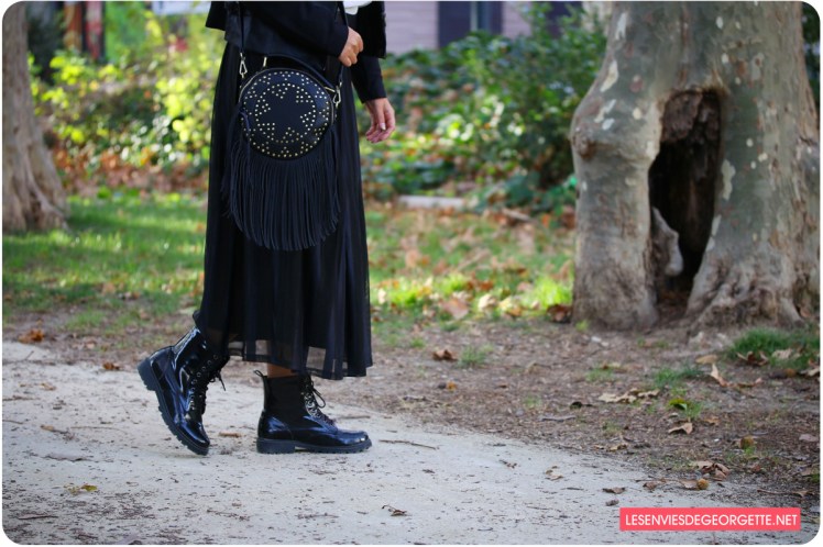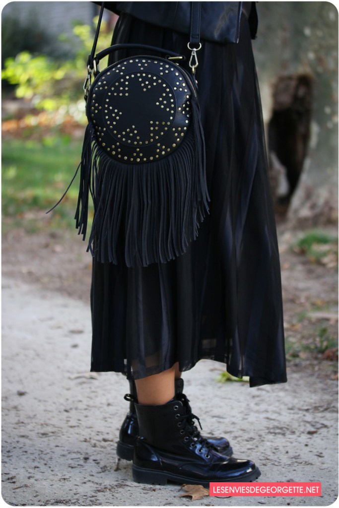 En ce moment je ne porte que des boots style doc Marteens (ici des H&M qui ne se font plus, elles étaient en simili cuir !), j’aime bien car ça apporte de suite une petite touche rock en plus d’être super confortable… et j’ai aussi totalement craquer sur le sac de la collection automne de Elora, de forme ronde hyper tendance avec des franges, des clous…