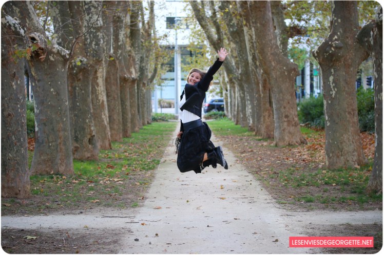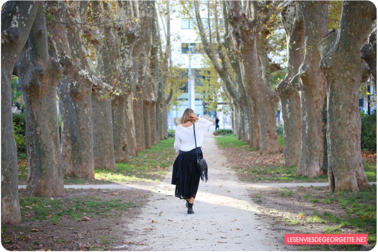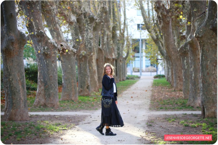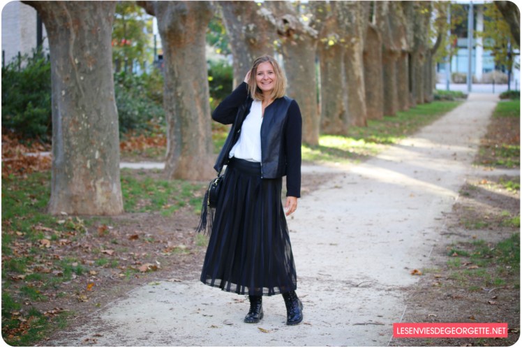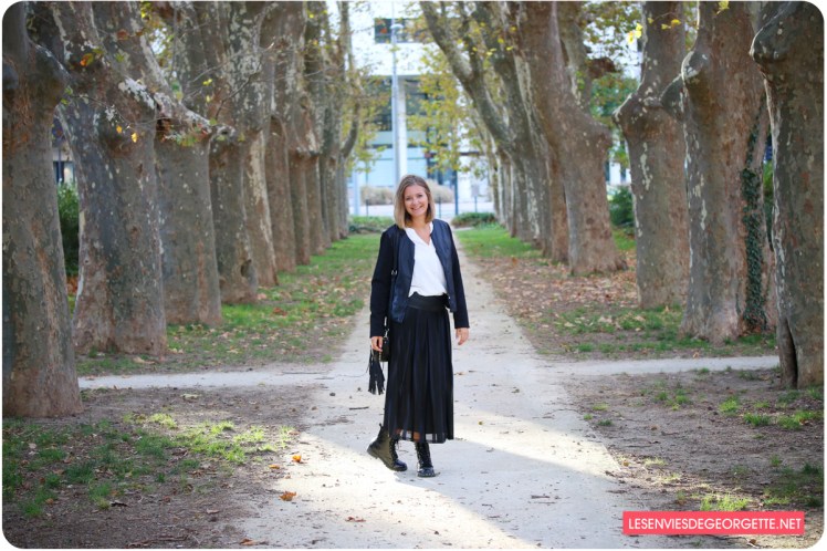 A côté de ça, dans cette nouvelle collection j’ai aussi flashé sur une jupe longue plissée avec des voilages et une ceinture en simili cuir, hyper sympa aussi. Je la porte avec une blouse ample que je rentre dans la jupe. Cette blouse a un peu de dentelle sur les épaules, elle est parfaite pour la mi saison quand il ne fait pas assez froid pour porter des gros pulls mais plus assez chaud pour mettre des t-shirt… Je la porte avec une veste en simili cuir que j’aurai du prendre dans la taille du dessous (ici 40).