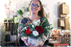 De temps en temps, elle propose des ateliers comme celui que nous avons suivi, où nous devions faire un centre de table de Noël 😉 Il fallait donc faire une composition florale dans une bûche. Aude a d’ailleurs beaucoup de patience, car il faut dire que si certains se sont découvert une vocation de fleuriste, ce n’était pas le cas de tout le monde ! Pour ne pas louper le prochain atelier, n’hésitez pas à la suivre sur Facebook 🙂