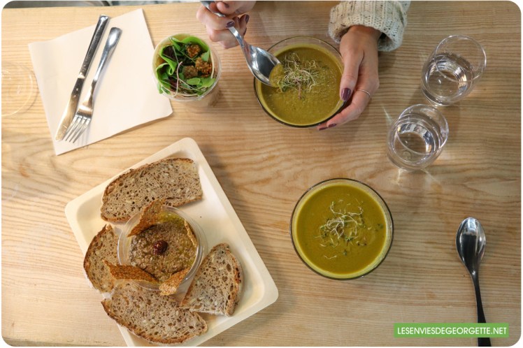 Niveau bouffe, que des trucs sympa : soupe, burgers, wraps, salades, paté veggie… à des prix du marché.