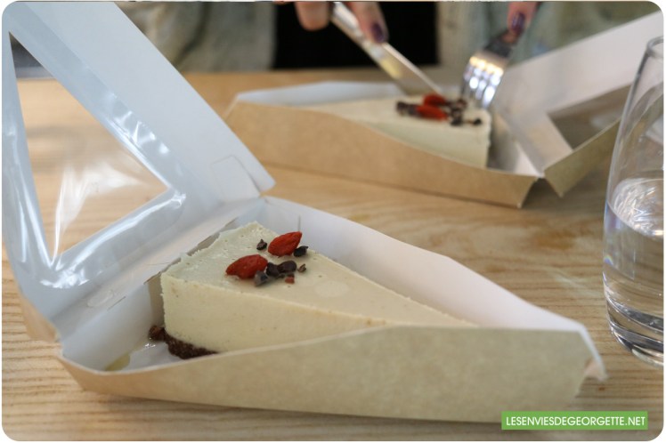Pour le dessert, nous avons voulu tester le cheesecake. J’avais peur car la dernière fois que j’ai mangé un cheesecake vegan c’était au Portugal et c’était vraiment pas très bon. Ici, franchement, c’était une tuerie ! A base de noix de cajou, il est vegan et Raw, c’est à dire, sans cuisson. Je ne sais pas comment ils arrivent à avoir cette texture, aussi bien pour le biscuit que pour la partie « cheese », mais c’est réussi.