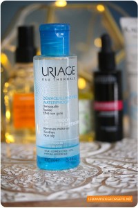 En premier, le soir, je démaquille mes yeux avec un produit dédié. Ici, un démaquillant waterproof bi-phasé de Uriage.