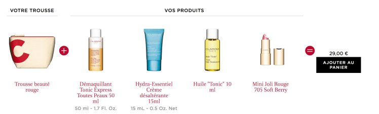 Si on a pas trop envie de se prendre la tête à choisir à droite à gauche, j’ai vu sur Clarins qu’on pouvait personnaliser sa trousse. Je l’ai faite moi pour 29€ on a 4 produits de la marque, dans des formats voyage mais qui restent assez généreux quand même.